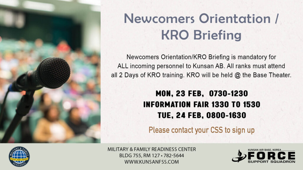 Newcomers Orientation/KRO Briefing is mandatory for ALL incoming personnel to Kunsan AB. All ranks must attend all 2 Days of KRO training. KRO will be held @ the Base Theater.